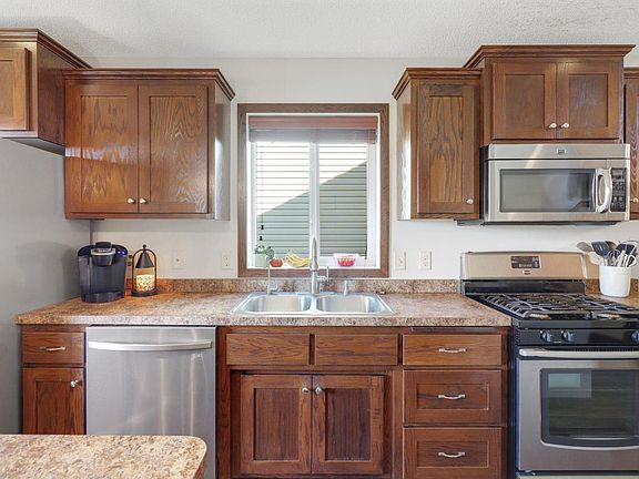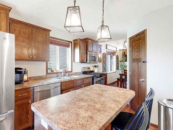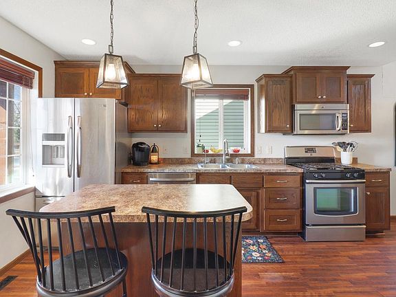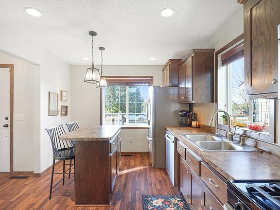 Single-owner 4BR/2BA, 1,940 FSF walkout split, just blocks away from a new park with a playground. Above–builder-grade finishes, huge kitchen (SS, pantry, breakfast bar), private primary suite w/in-floor heat & jetted/Jacuzzi tub. 3 BR on one level. Compact unfinished 4th level w/rough-in for future 3rd bath (buyer to verify). A Minnesota must-have, the 3-car garage provides room for vehicles, toys, work bench and plenty of extra storage. Outside, you'll enjoy the fenced backyard, covered porch, and large backyard patio. Minutes to restaurants, shopping, & Hwy 10.