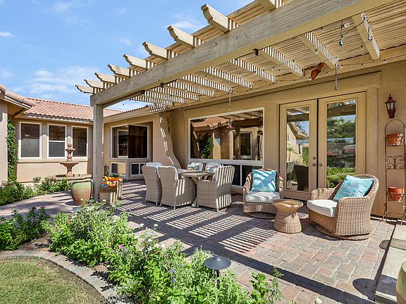 Salt water poolFocal point fireplaceBreakfast barPrivate resort style oasisLush and tropical landscapingTravertine floorsVersailles-pattern travertine flooring