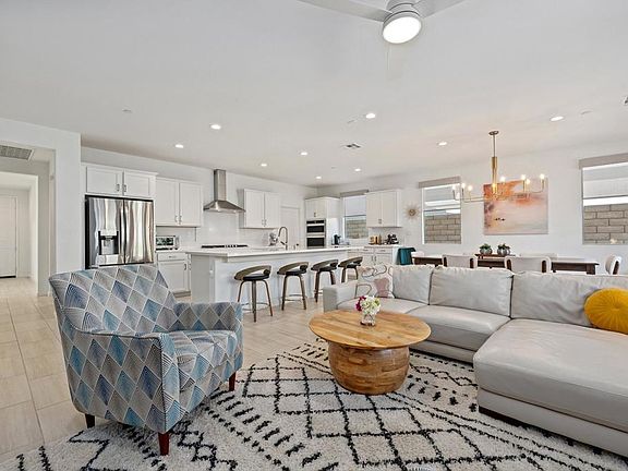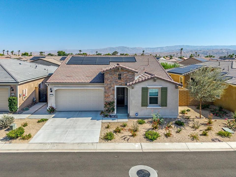 Welcome to Domani, a premier 55+ gated community in Palm Desert offering resort-style amenities and a vibrant lifestyle--all with low HOA dues. This highly desirable Bellwood floor plan features three bedrooms, two bathrooms, an open-concept great room, and a spacious primary suite. The home is light and bright, showcasing modern high-end finishes and hard surface flooring throughout. Additional features include quartzite countertops in bathrooms, a water filtration system, solar panels, a tankless water heater, custom window coverings, and a two-car garage. The backyard is designed for relaxation, featuring a covered patio, a Zen garden, and low-maintenance landscaping that includes fruit trees. Offered furnished per inventory, this home is move-in ready. Residents of Domani enjoy access to a 5,300 sq. ft. clubhouse, fitness center, resort-style pool, pickleball, bocce ball courts, dog park, and more--all near shopping, dining, golf, and entertainment. Schedule your appointment today to see this immaculate well cared for home.