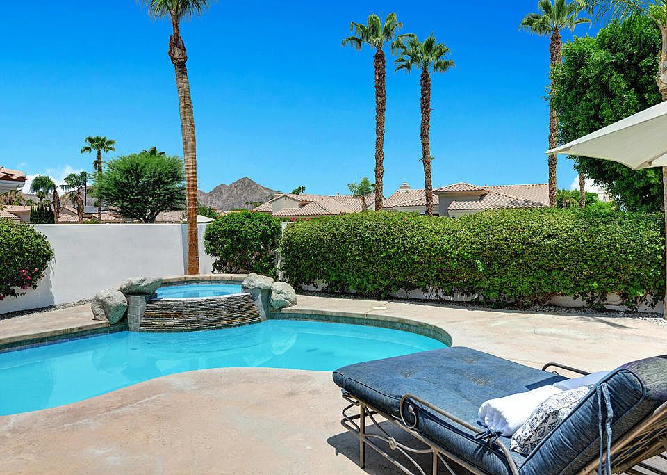 Discover modern luxury in this stunning contemporary home with captivating views, and a sparkling saltwater courtyard pool and hot tub. You'll feel the freedom of space when you enter the open-concept layout, featuring high ceilings. The updated kitchen shines with quartz countertops and a spacious walnut island with bar seating. The contemporary tile floors flow throughout and into the expansive master suite, which offers breathtaking mountain views and a luxurious ensuite with: sunken Jacuzzi tub, seamless glass walk-in shower, dual vanities, and a large walk-in closet. Two additional bedrooms, including an ensuite room with mountain views and a walk-in closet, provide ample guest accommodation. Garage flooring was just recently epoxied for a pristine finish throughout. The community includes a pedestrian gate out of the community for quick access to Old Town La Quinta or The Citrus Club golf course. Low HOA fees include a guard gate, exterior tree and yard maintenance, Internet, Cable TV and trash collection. This home is a contemporary masterpiece, blending elegance with comfort. Fully Furnished, Turnkey, ready to enjoy!