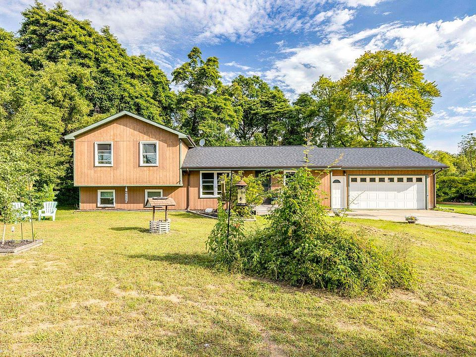 This split level home is situated on over an acre with beautiful mature trees enveloping the backyard for lots of shade and wildlife. Horseshoe driveway lined with multiple types of apple trees. Huge family room with bar area great for family gatherings. Open concept entry floor with kitchen and dining area. Multiple outbuildings 1 larger shed barn and 2 other sheds for storage. 2.5 car garage with workshop area and wood burning store. Brand new windows last year in all of home.