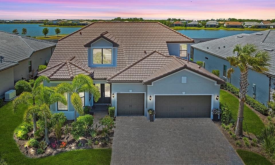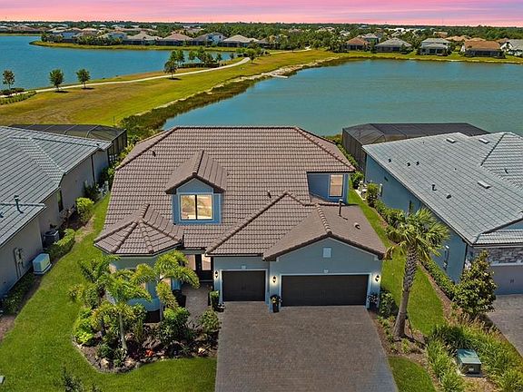 Positioned on a premium south-facing lakefront homesite with tranquil water views, this exceptional residence in Lakewood Ranch Waterside combines luxury, comfort, and versatility in one of the area’s most desirable settings. The main level showcases a thoughtfully designed great room floor plan with soaring volume ceilings, crown molding, and custom coffered detailing, creating an open and inviting atmosphere. The kitchen serves as the heart of the home, featuring a large leathered quartz island with seating, a gas cooktop, stainless steel appliances, and an expansive walk-in pantry. Step outside to an impressive outdoor living space, where a saltwater pool and spa are perfectly screened with clear-view panels, maximizing the expansive lake views. The covered lanai offers generous space for both dining and lounging, creating an ideal environment for relaxation and entertaining. Inside, the primary suite offers a peaceful retreat with a walk-in shower, private water closet, and an oversized dressing room with custom organization. Two additional bedrooms and bathrooms on the main floor provide comfortable accommodations for family or guests, while the second level offers a spacious bonus room, fourth bedroom, and full bath—perfect for visitors, working from home, or recreation. Shoreview residents enjoy resort-style amenities including a clubhouse with pool, spa, indoor and outdoor bar, lakeside dock with kayak launch, tennis, pickleball, bocce, fitness center, fire pit, event lawn, and dog parks. Easy access to Water Taxi to Waterside Place where you can enjoy vibrant shops, restaurants, and events. This residence is also just minutes to Lakewood Ranch Main Street, University Town Center, I-75, highly-ranked schools, premier healthcare facilities, and the pristine white-sand beaches of the Gulf Coast.