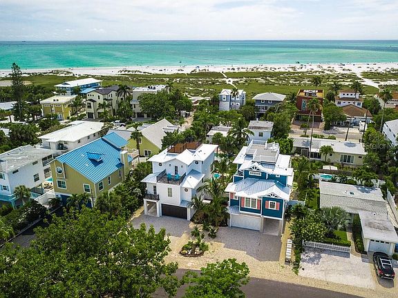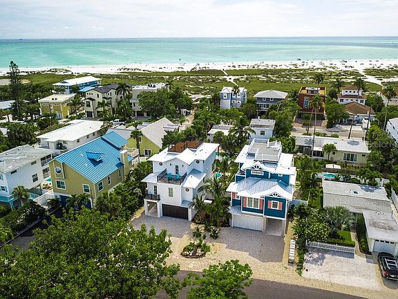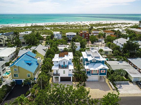 Coastal construction 5-bedroom home with 4 baths is located on the highly desirable northern end of Anna Maria Island. The home has upscale finishes and an amazing floor plan with open concept kitchen, dining and living area. In addition, there's a wall of sliders at the back of the home, which provides tons of natural sunlight and extends the living area. On the main living level, there are also 3 bedrooms, one with an ensuite and an additional bathroom for the other two to share. On the second living level you'll find the master suite with dual sinks and a huge walk-in shower. There's an additional bedroom and ensuite bath. Then home offers a private heated pool with a sun shelf and spa. The outdoor covered area provides plenty of shade for relaxing and yet staying close to all the pool fun. The home has lots of storage including the 3-car garage. This home is located at a beach access and just two homes away from the gorgeous sandy beaches on Anna Maria Island. Plus, the home is located just a few blocks away from Pine Ave, which offers shops and restaurants and of course.