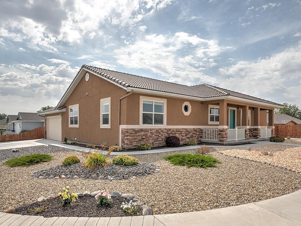 BEAUTIFUL CUSTOM CITY HOME. This very well kept home features 2080 square feet, 4 bedrooms and 2 bathrooms. Great room concept with large living room and 10 foot ceilings throughout the home. Custom built in shelving and pot shelf that is well lit. Wonderful kitchen with lots of counter and cabinet space, tile flooring and quartz countertops. A large breakfast bar and built in desk area in the kitchen with great views out of the front of the home. Large Master suite features walk in closet, Oversized laundry area with large storage closet and garage is fully finished. Property is fully landscaped with zero scape allowing easy maintenance. Front covered patio, tile roof, stucco exterior with custom rock work. Nice concrete patio off the back of the home with a nice sized fenced back yard. Large concrete driveway that will allow for RV parking.