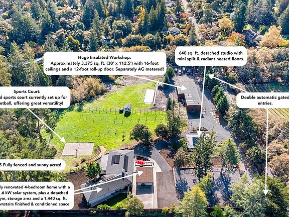 This property is loaded! Whoever snaps it up hits the jackpot! Turn Key, Hugely Versatile, Meticulously renovated and just 5 minutes to town, this one of a kind country property invites multi use & generational living. On 5.45 open & sunny acres, the single level home w/2450 sq.ft. and 4 bdrms wraps in nature, verdant & distant views. Expertly renovated, the kitchen & primary bath are new and gorgeious, solid core doors & crown moulding elevate the feel, HVAC is new, lighting is new, roof is 2021 to name just a few improvements! Premium dnstairs space with it's sep entrance is 1440 sq.ft, fully finished, conditioned & w/a full bath. Ideal for a home office, home based business, cottage industry, guest, all of the above! Additionally there's a detached Studio, charming with vaulted ceilings and covered veranda. A young orchard with yummy Santa Rosa plums, Golden Delicious, Honeycrisp & Gravenstein Apples, citrus & more leads to the huge & separately gated 3,375 sq.ft Shop featuring a 12 ft. roll up door, 16 ft. ceilings. It's improved w/a 200 amp AG meter service for lower rates and hose bibs on the exterior. The solar system is owned & serves all domestic dwellings, there's a lighted basketball sports court, nat gas, high speed, motor home hookups, garden beds, fully fenced. Wow