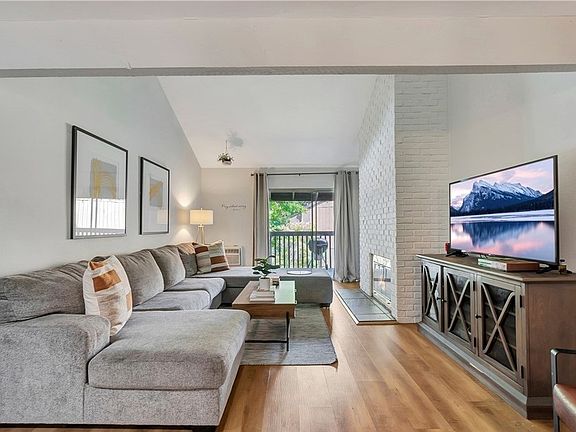 Welcome to this stunning 1-bedroom, 1-bathroom condo in the highly sought-after community of The Lakes. Spanning 1,101 square feet, this home boasts a bright and open floor plan perfect for comfortable living and entertaining. The unit features wide plank vinyl flooring, vaulted ceilings, and a floor-to-ceiling brick fireplace. The spacious primary bedroom includes his-and-her closets, a vanity area, and an adjoining full bath.