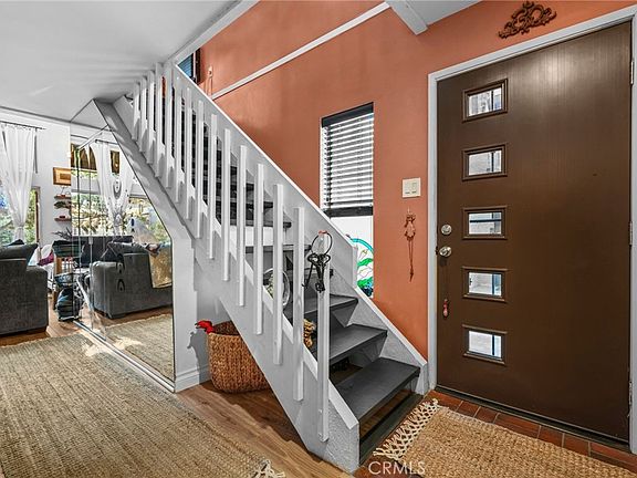 New wood-like laminate plank flooring runs throughout the main level, complementing the open layout. Additional conveniences include a skylight, pantry at the entry and a generous storage closet tucked beneath the staircase. Sliding doors invite natural light into the living space and open to a private patio with a babbling brook that runs nearby—perfect for outdoor dining or unwinding after a long day.