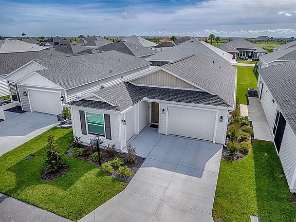 Welcome to the Village of Shady Brook where this Emerald model is a gem that will truly dazzle you! This home is as close to brand new as you can get! It has only been occupied for a few days in the past year and is being offered completely TURNKEY WITH GOLF CART! It also has a GOLF CART GARAGE! Some of the many features are high 10’ ceilings, no popcorn, sturdy premium laminate wood look flooring, tile floors in bathrooms, QUARTZ counters, new appliances (GE), washer and dryer, HUGE primary closet, SMART HOME (Centric Fiber), GAS RANGE, gas dryer and gas tankless water heater. Many upgrades have been made such as gutters added, blinds and room darkening drapes, Fandeliers (as opposed to basic ceiling fans), permanent air filter (no changing), timer fans, soft close toilet seats and bidet seats in both bathrooms, glass shower doors that have been treated to prevent water spots, clothes hanging rack in laundry closet, pullouts in cabinets, Ecobee ring doorbell and keyless entry keypad. This home comes complete with all new furniture in a clean, contemporary style, including a beautiful leather sofa with lumbar support. This neighborhood is a prime location in that it is only 1.8 miles from Eastport Town Square and is surrounded by Shallow Creek Golf Course. Don’t miss out on your opportunity to buy new and have all the work done already!!! Call today for an appointment!!