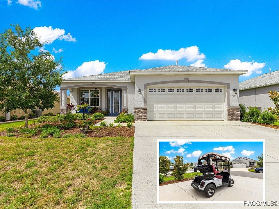 Orchid model, in the popular neighborhood of Weybourne Landing, part of the vibrant On Top of the World community. Built in 2022 this home features 3 bedrooms, a versatile flex room – perfect for a home office or hobby space, 2 bathrooms and a 2 car garage with an impressive amount of upgrades. The widened driveway, elegant stone accents, covered front porch and stylish glass-etched front door are the first of many upgrades you will see as you enter this home. On the inside, there is brand new Luxury Vinyl Plank flooring throughout, crown molding, tray ceilings. The open floor plan in this home provides the perfect setting for entertaining! The kitchen has granite countertops, backsplash, granite sink, staggered soft close cabinets with crown molding and Stainless-Steel appliances. The primary bedroom has a tray ceiling and a large walk in closet. The ensuite bathroom has dual sinks, granite countertops, linen closet, tile walk-in shower with seat and shower niche. The two guest bedrooms have convenient access to a full bathroom with granite countertops and a tub/shower combo with tile. The inside laundry room includes the gas dryer. The Golf Cart stays! The screen lanai with ceiling fans has a knee-wall in place for privacy and makes for an easy conversion to a sunroom. Outside the screen lanai, there is an open paver patio and a gas line for grilling. Weybourne Landing offers a low HOA with an electronic gate system and incredible amenities including; clubhouse, pool, fitness studio, pickleball courts, miniature golf, dog park and more! Schedule your private tour today!