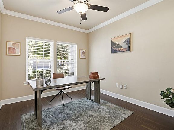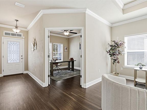 Don’t miss out on this stunning 3-bedroom, 2.5-bath home with a study in the highly sought-after Longleaf community!?This barely lived-in home shows like new, featuring fresh landscaping, soaring ceilings, and expertly installed luxury flooring throughout. From the moment you arrive, you’ll be charmed by the inviting front porch and the home’s incredible curb appeal. Step inside to find a bright, open floor plan designed for both comfort and style. The foyer opens into a grand living room with tall tray ceilings and elegant crown molding. Just off the entry is a private study with French doors, perfect for working from home or a quiet retreat. The split-bedroom layout offers two spacious guest rooms and a full bathroom tucked away down a separate hall, while the primary suite is its own serene getaway featuring a large walk-in closet, garden tub, and walk-in shower. The kitchen overlooks the living area, creating the perfect setup for entertaining. It boasts granite countertops, rich wood cabinetry, stainless steel appliances, and a long breakfast bar for extra seating. A half bath and dedicated laundry room sit conveniently off the kitchen, along with access to the backyard. Outside, enjoy a covered patio and a fully fenced yard, ideal for relaxing or entertaining year-round. The home also includes rear access to a two-car garage and private driveway. Longleaf offers a true community feel with resort-style amenities, including a clubhouse, fitness center, pool, playgrounds, and walking trails, all just minutes from shopping, restaurants, and I-75.