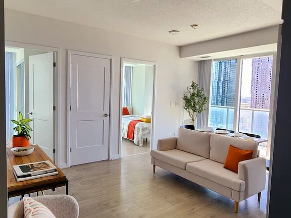 A Stunning modern, corner unit condo apartment centrally located in the heart of Vaughan! Step inside to a thoughtfully designed and functional floor plan flooded with abundance of natural light. This open concept corner unit features 2 bedrooms, 2 full size bathroom, 9 ft. ceilings, quartz countertop, premium appliances, floor to ceiling windows and walk out to huge balcony with a south facing unobstructed beautiful view towards pons, greenery and Vaughan downtown and no future development plans directly in front of you. This unit included 1 parking spot and 1 locker. Greatly situated for ease and entertainment this address places you just steps away from Vaughan TTC Subway and Bus Terminal. Just Minutes away to highway 400/407. Vaughan Mills Mall, Colossus Centre, famous restaurants, movie theatre, Canada's Wonderland, York University and more. Residents enjoy exclusive access to a suite of condo amenities. This included party rooms, games, theatre room, gym with yoga room, Whirlpool and Sauna/steam room, Outdoor patio with BBQ's.