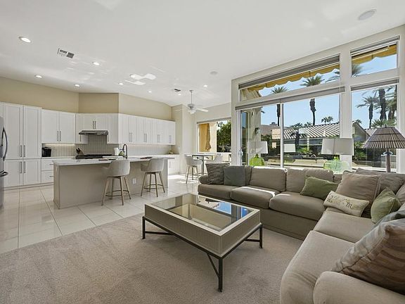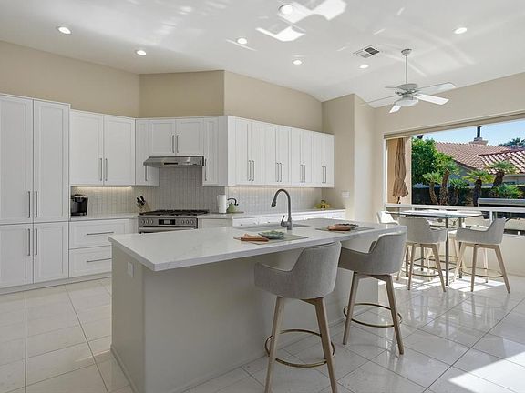 Modern Luxury Meets Desert Serenity - Reintroducing this beautiful recently reimagined & remodeled desert retreat, where the transitional design and thoughtful upgrades create the perfect blend of comfort and style. This 3-bedroom, 2.5-bath residence has been meticulously remodeled and refreshed and is ready to impress even the most discerning buyer.Step into the heart of the home -- a fully remodeled kitchen featuring sleek white custom cabinets, luxurious quartz countertops, premium stainless steel appliances including a 6-burner range with built-in air fryer, and an open-concept layout ideal for entertaining. The dining room has been transformed by the removal of columns, enhancing the flow and showcasing a chic built-in wine fridge.Both the guest and primary bathrooms echo the home's modern aesthetic with fresh white cabinetry, quartz counters, and updated fixtures. The expansive primary suite is a true sanctuary, offering a large walk-in closet, dual vanities, and a spa-like bath with a separate tub and glass-enclosed shower.Enjoy stunning mountain views from inside and out, creating seamless indoor-outdoor living. The generously sized lot features a beautifully updated Wi-Fi remote controlled pool and spa , mature landscaping, and your own fruit trees -- pink grapefruit and lemon -- adding a touch of the good life.. .Additional highlights include: Newer Wi-Fi controlled zoned AC system, newer LED lighting, newer pool heater. The oversized 2 car garage + golf cart/workshop area has newer motors and WI-FI controlled garage doors. Located in a convenient guard-gated community with low HOA dues that include front yard landscaping, Spectrum cable, and 24/7 security, this home is just minutes from Old Town La Quinta's shops and dining and the SilverRock Golf Resort -- where residents enjoy special discounts.