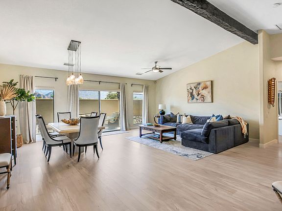 Experience upscale desert living in this beautiful 3-bedroom, 2-bath home nestled in the prestigious 24-hour guard-gated Lake La Quinta community. Spanning over 2,200 sq. ft., this stylish residence offers a seamless blend of comfort and sophistication. A private gated courtyard sets the tone for peaceful mornings or tranquil evenings. Step through grand double doors to discover soaring wood-beamed ceilings, panoramic Santa Rosa Mountain views, and an inviting open-concept layout perfect for entertaining. The chef's kitchen is a standout, boasting quartz countertops, sleek white cabinetry, stainless steel and black Bosch appliances, double ovens, a wine fridge, and a modern sink with upgraded fixtures. It flows effortlessly into the cozy family room with a fireplace an ideal space for intimate gatherings. The spacious primary suite offers direct backyard access and a spa-inspired en-suite bath with dual vanities, a soaking tub, separate shower, and large walk-in closet. Two guest bedrooms, a full bath, and a dedicated laundry room complete the interior. Outside, unwind in the peaceful backyard oasis featuring a rock waterfall and lush landscaping. A 3-car garage provides plenty of space for parking and storage. Don't miss your chance to live in one of La Quinta's most sought-after communities.