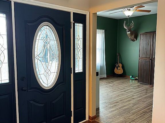 Wood fireplaceLarge islandShed near drivewayComposite decking patio porchHot tubBig foyerLarge laundry room
