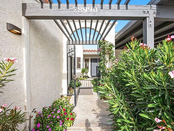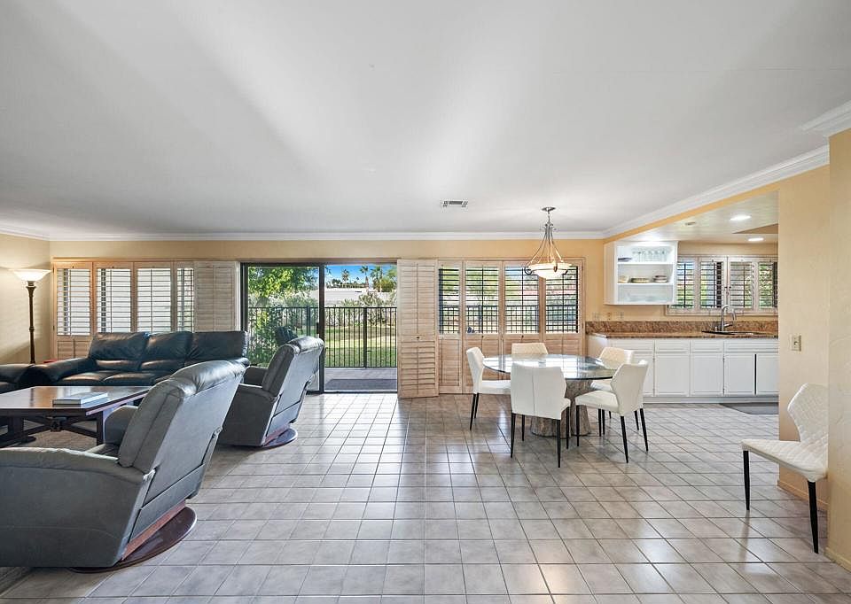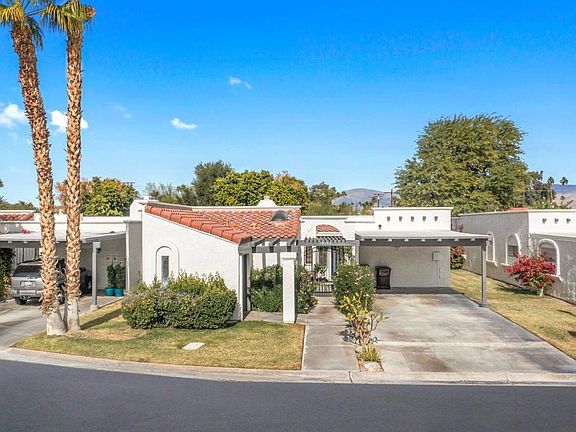 Welcome to this move-in ready, best valued condo home in the Desert! This spacious 2 bed, 2 bath, plus versatile office/den area home offers a perfect blend of comfort and convenience. The open floor plan spans a total of 1818 square feet with tile flooring throughout and includes split bedrooms offering privacy. The master bedroom features built-in cabinets and a private on suite bathroom, large soaking tub, and separate shower. Enjoy the cozy family room with a stone fireplace and built-in entertainment cabinet. The gourmet kitchen features granite countertops, stainless steel KitchenAid appliances, and a 6-burner gas stove. Step onto your covered, gated patio with misters, spanning the length of the home, overlooking the large, community grass backyard where you can enjoy your morning coffee, outdoor dining, or relaxation. Take a stroll across the cul-de-sac to the community pool and spa and stop to pick the community lemons, grapefruits, and oranges. Conveniently located in the prestigious Bermuda Dunes Country Club, offering optional golf and social memberships and located in IID Electric District (lower electricity costs). HOA includes cable/internet, water, septic, landscaping, roof, and exterior painting (completed in 2022). Don't let the Desert's best valued condo pass you by!