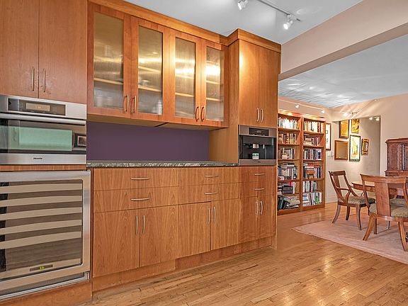 The beautifully renovated, windowed galley kitchen has been designed with both function and elegance in mind complemented by Brazilian granite countertops and stainless steel appliances. Just beyond the kitchen is a wall of custom built cabinetry housing an espresso bar, wine fridge, and microwave oven, all premium appliances by Miele. The adjoining formal dining area creates a seamless flow for hosting.