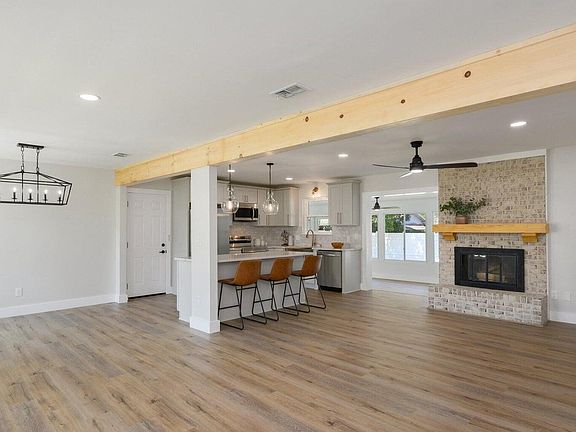 No more boxy, closed-off rooms! Instead OPEN-CONCEPT LIVING achieved, with knotty pine wood beam and recently-refurbished brick fireplace and matching knotty pine mantel.