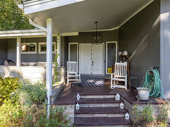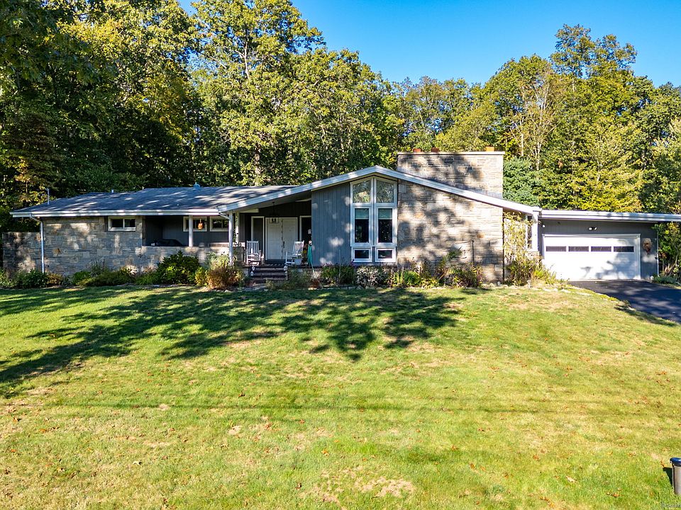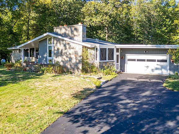 Distinctive Contemporary Ranch set on a peaceful cul-de-sac with lush plantings. The upper-level features 3 bedrooms, including a primary suite with 2 closets and a luxurious full bathroom. The en suite bath showcases a slate tile floor, recessed lighting, a separate vanity area, bubbling soaking tub, & a Roman-style walk-in shower finished with marble and riverstone details. The remodeled kitchen has granite countertops, stainless steel appliances, cook top, wall oven and a solar tube for added daylight. The adjoining eating area flows seamlessly into the dining room & sunken living room, with cathedral ceilings, skylights, floor-to-ceiling windows, stained glass and a stone fireplace with wrought iron accents and a chiseled stone mantel. One of the most beloved spaces in this home is the screened-in sunroom, which features its own stone fireplace. The lower level offers a 4th bedroom, full bathroom & a large family room with a 3rd stone fireplace. This one features a high-efficiency Jotul wood stove insert with blowers, ideal for supplemental heating. A walk-out glass door leads to the patio and backyard. Additional highlights include abundant natural light through skylights, solar tubes, and large windows, central air conditioning, and a double-door front entry that leads to a covered stone porch. The property also includes hardwood floors, recessed lighting, 2 car garage, shed, new oil tank, new septic in 2020, replacement windows and has a hardwired generator.