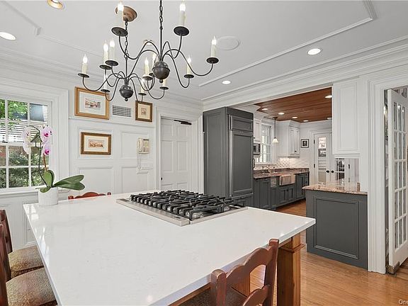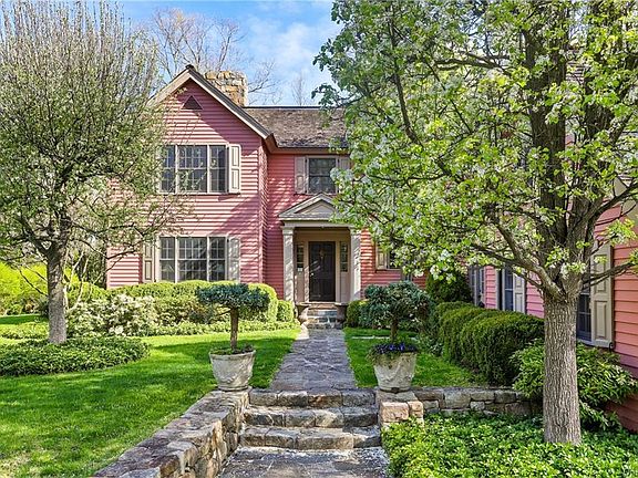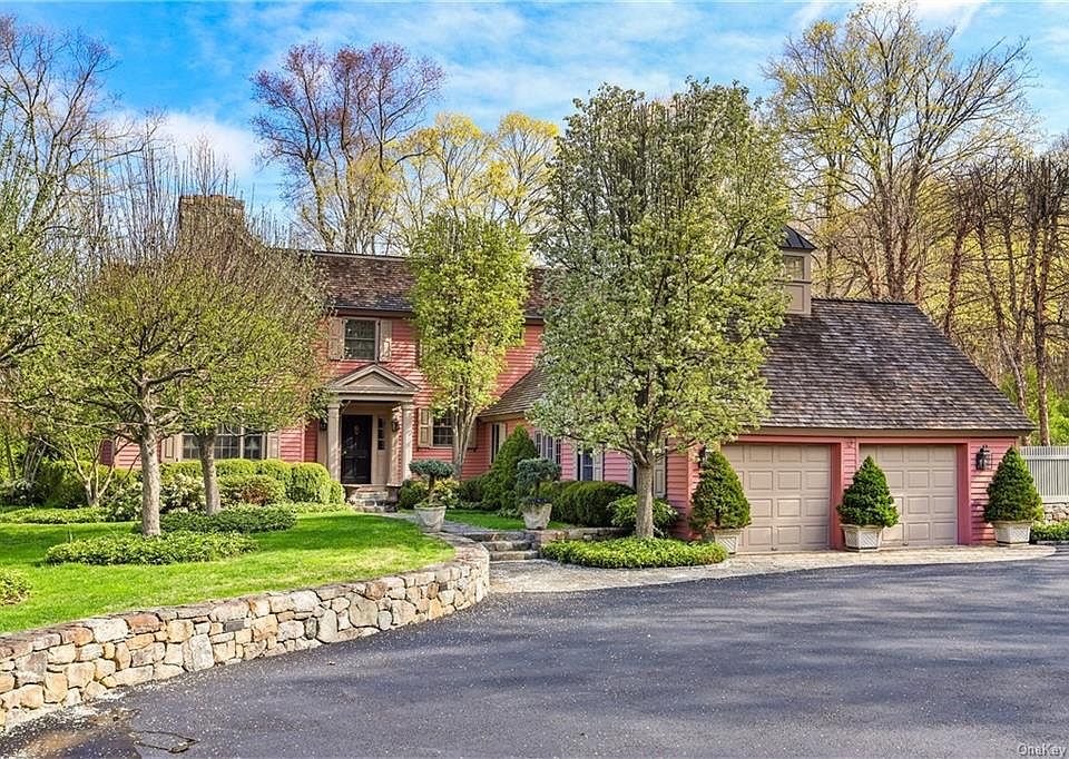 An extensive 2007 renovation of house and property created this private gated paradise complete with vineyard, orchard, a beautiful gunite pool and spa for ten guests, gorgeous stone walls, bluestone patio with outlets, an outdoor bar and kitchen wired for communication and outfitted with stainless appliances including Lynx grill, refrigeration drawers, storage and sink. The house is picturesquely set among thoughtfully designed professional landscaping maintained by a 30 zone watering system. Renovation of the house included all new electrical work featuring internet & digital surveillance wiring throughout, whole house 25k generator, new windows, insulation, gas fireplaces, addition of custom millwork: crown, baseboard and decorative moldings, new chimney, thermo-regulated roof with cedar shake, and more. The entry Foyer leads to a handsome front living room/office with built-ins, fireplace and wood floors. The eat-in-kitchen with copper farmhouse sink, wine refrigerator, granite counters and custom cabinetry features a sunny island eating area overlooking the pool and patio, and connects to a heated breezeway with powder room, mudroom, laundry and door to outdoor shower. A second door leads to the heated garage which is wired for sound. The spacious dining room includes french doors to the mahogany deck and a built-in wet bar with onyx marble. The grand living room with coffered ceiling offers a second fireplace and wall of windows/doors. The first floor bedroom is perfect for guests, or a primary alternative, with transom and bay window plus a full bath. On the second floor is the bright primary suite with dressing nook, closets and a spacious custom bath. A second bedroom features a beautiful view of the pool and property and shares a hall bath with the fourth bedroom which includes the third fireplace. The finished lower level offers an additional 1230 square feet of space not included in the total. This tranquil 3 acre parcel is located just down the road from Ward Pound Ridge Reservation and is convenient to shopping and highways. A very special offering.