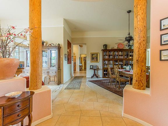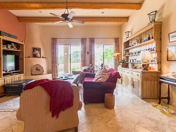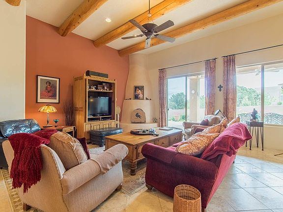 Cielo Grande on 3/4 acre Conservation Lot. Gorgeous views of Sangre de Cristo and Jemez Mountains. Professionally landscaped with fruit trees. In-ground sprinkler system. 430 feet of Santa Fe style wall with custom wrought iron gates. 2 Arizon flag stone patios. Quality built in 2003, 3160 sq.ft. 4 bedrooms with 5th bedroom used as an office, 3.5 baths. Granite bar in kitchen, kiva fireplace, vigas in Great Room, radiant heat, 7 ceiling fans, evaporator coolers, numerous upgrades, oversized 2 car garage, must be seen to be appreciated.