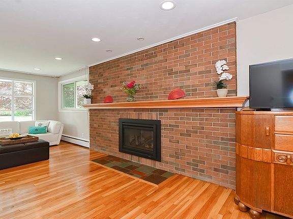 Mid-century ranch! Glass block lets light into the foyer accented by a beautiful slate stone floor. Step up to the front to back living room, flooded with light from the 12-panel authentic rounded bay window. Stylish brick accents the fireplace wall with custom mantle. Enjoy the convenience of a gas log fireplace. Gleaming hardwood floors unite the living, dining and kitchen, as well as the entire bedroom wing. The kitchen has the original custom plywood cabinets - immaculately refinished - & the original pink enamel wall oven! A center butcherblock island completes the cooking area. There are 3BRs & a full bath complementing this level. Step down from the kitchen to the 3-season sunroom with vaulted ceiling. The covered patio beckons one to enjoy summer evenings gazing out at the peaceful back yard. The lower level of this house was gutted, & is now ready for finish. Build your family room around the raised hearth fireplace. A great opportunity close to town center!