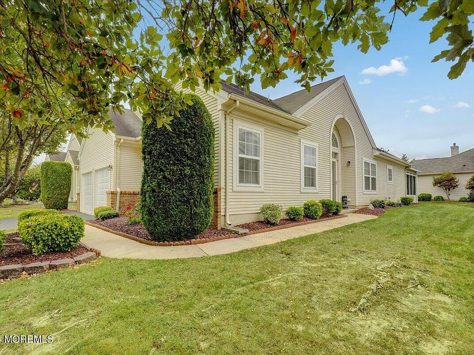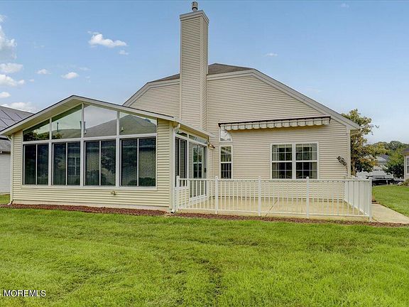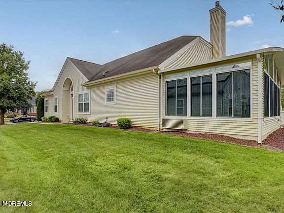 Beautifully maintained with a newer HVAC system! The temperature-controlled sunroom, with floor-to-ceiling windows, provides loads of natural light and offers direct access to a charming, fenced patio for outdoor relaxation. A beautiful palladium window welcomes you home to a bright and airy entryway where hardwood floors and decorative molding set the tone for the care and attention you'll find throughout the home. Just off the entrance is the formal dining room, perfectly positioned for easy access to the kitchen and ideal for hosting gatherings. The kitchen is a true chef's delight, with 42-inch cabinets, sleek granite countertops, stainless steel appliances and a pantry which adds to the abundant storage options. A cozy den with a gas fireplace is the ideal place for catching up on your reading on chilly winter evenings. Two en suite bedrooms both have walk-in closets. The primary bedroom also features a vanity and a sitting room/office accessed through double doors. Additional storage can be found in the attic. Recent home improvements include a new HVAC system, new garage doors and recoating on the driveway. Pride of ownership is evident at every turn. Enjoy the thoughtfully designed community amenities. The center of activity is the community's 30,000-square-foot clubhouse, which includes a spacious state-of-the-art fitness center, a sauna, locker rooms, and an indoor pool. Outdoors, residents can enjoy basketball, tennis courts, horseshoe pits, as well as shuffleboard and bocce ball courts, and a resort-style pool alongside a whirlpool spa and patio.