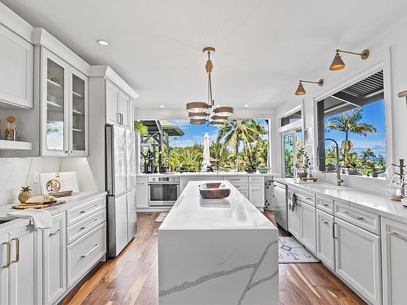 The interior dining area opens to a wraparound lanai with weather-resistant Trex decking, offering space to host a meal, dancing, lounging, and whale watching—this is the entertainer’s dream!