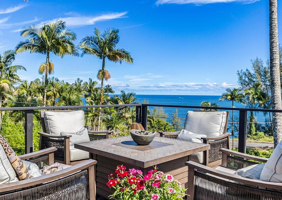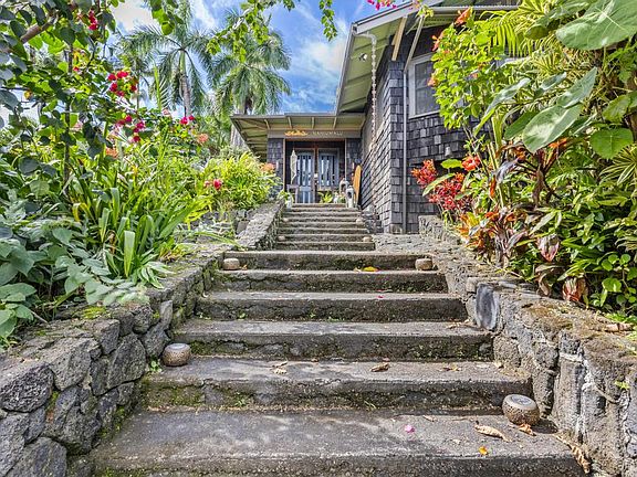 Perched on Halaulani Place—one of Hilo’s most prestigious neighborhoods, known for its carriage lights and tree-lined streets—the home sits high above a fern-covered slope, offering breathtaking views of Kalalau Stream and the expansive ocean beyond.