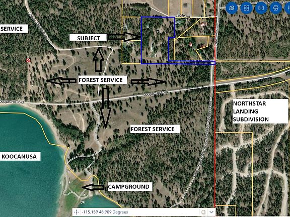 7.296 Acres bordering over 500 acres of Forest Service land with direct access to Lake Koocanusa. No Covenants, less than 1/2 mile to Douglas Hill Campground on Lake Koocanusa, Northstar Landing Subdivision just across the road, 3.5 miles to Wilderness Club Resort, & only 4.5 miles from Eureka, this property is poised with potential! The rustic 3 bed 1 bath main house, and guest cabin, offer a stable starting point for remodel or home base while you build your dream home. No covenants opens this property to many uses. Looking for a horse property with access to the Forest Service? Maybe you want to use part of the property for commercial boat storage for nearby Lake Koocanusa, or self storage for the growing subdivision across the road. Or maybe it is the perfect place for you and your friends and family to have a place for RV's and Toys for the summer in Montana. Bring your imagination and take a look at this rare find in the heart of Lake recreation and living in NW Montana.
