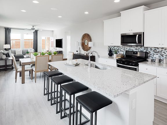 A charming single-level home with a contemporary kitchen and connected dining and Great Room, perfect for hosting friends and family. Enjoy a chef inspired kitchen with included Stainless Steel appliances, center kitchen island and walk-in pantry. The Owner's Suite is secluded at the back of home and features a walk-in closet, bath with dual vanities and designated linen storage. The two secondary bedrooms are separated by a full bath. A large laundry room and coat closet is conveniently located as you enter from the two-car garage.