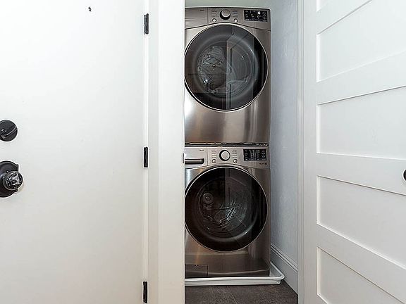 Private deckHigh-end finishesStackable washer and dryerRecessed lightingBack entranceBeautiful white cabinetryStainless appliances