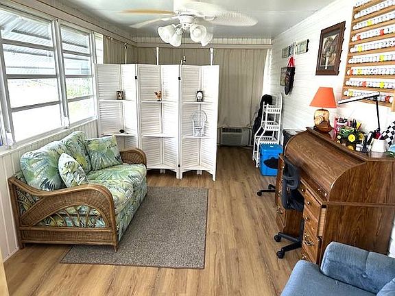This stunning 1,568 sq. ft. home sits on an extra-large perimeter lot and comes fully furnished with all the extras you could want. Enjoy a brand-new remodeled kitchen featuring granite countertops, new appliances, and vinyl plank flooring. The home also includes new vinyl windows throughout, a newer metal roof, and an AC system replaced in 2006. The split floor plan offers privacy and spaciousness, with large closets providing plenty of storage. Relax and unwind in the windowed, air-conditioned lanai or enjoy the outdoors from the large screened-in porch. Additional highlights include an extra-large covered driveway, a spacious shed, and meticulous care throughout. To top it off, this exceptional home comes with a generator and golf cart included-everything you need to move right in and start enjoying Florida living!