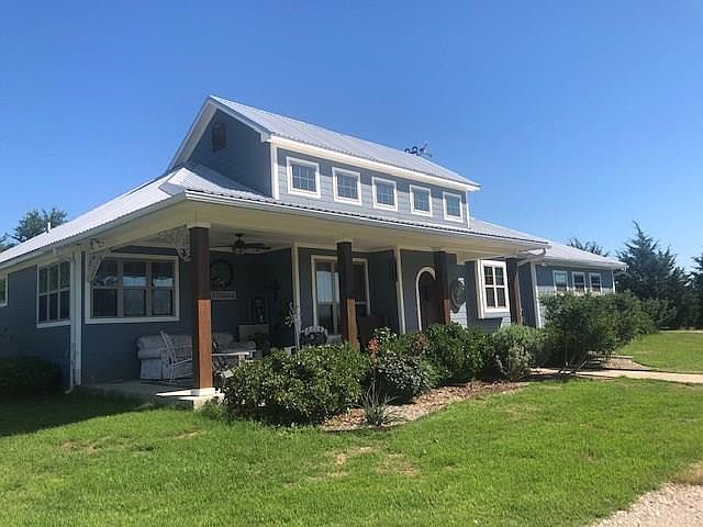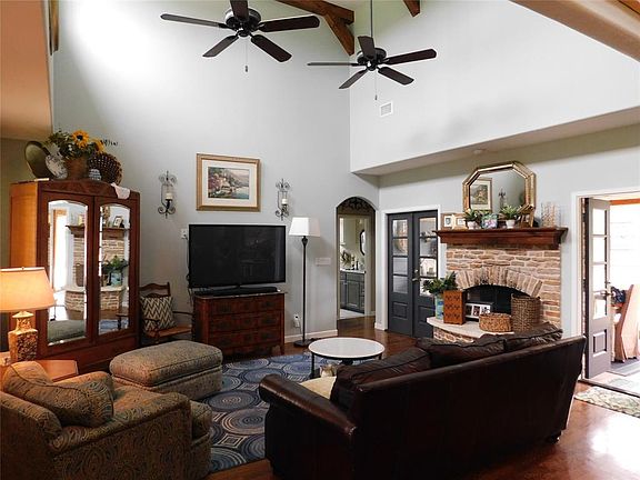 Gorgeous Hill Country style home on rolling 17 acres backing up to flowing creek & trees. Home features open spaces,18' ceilings in living & kitchen.Premium hardwood floors, KitchenAid & Whirlpool appls, built in refrig-freezer, solid wood kitchen island with prep sink, wine rack & chiller. Farm sink with quartz countertops & nook. Split bedroom arrangement, master his-her vanities, soaking tub, oversized walk-in shower with three water features & walk-in closet. Guest bedroom features mini kitchen & large closet. 3rd bedroom has double closets. Enclosed back patio with screened windows, ceiling fan, vintage farm sink for entertaining & extended outdoor patio with fire pit. Shop is 40 X 60 and has a full bath.