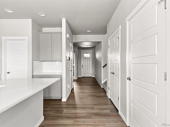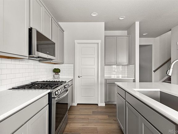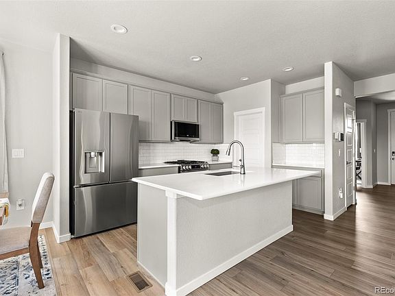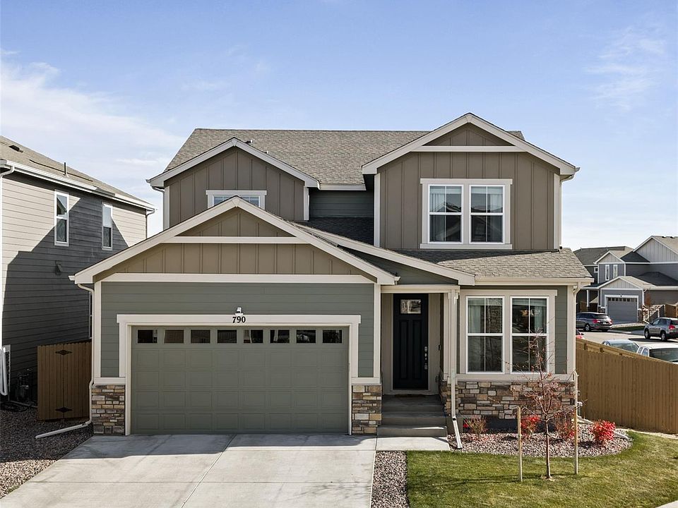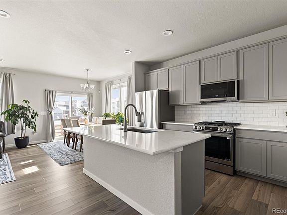 Beautifully upgraded two-story home located in the community of Lochbuie Station, a perfect blend of modern comfort, thoughtful design & quality craftsmanship. From the moment you step inside, you’ll be greeted by a spacious entryway & the warmth of wide-plank oak luxury vinyl flooring that flows seamlessly throughout most of the main level. Just off the entry sits a main floor office, ideal for working from home, or can function as a 6th bedroom. Continue inside to discover the heart of the home, an expansive open-concept living area where the kitchen, dining & family room connect effortlessly, creating the perfect setting for entertaining or relaxing. The main level features soaring 9 ft ceilings. The kitchen is a showpiece, featuring gray shaker cabinetry with soft-close doors & drawers, a crisp white subway tile backsplash, quartz countertops, stainless steel appliances including a gas range & kitchen faucet with a sensor & a large walk-in pantry. Thoughtful details like extra outlets & a built-in mudroom off the garage add everyday convenience. Tucked privately at the back of the home, a main floor bedroom sits near a full bathroom, perfect for guests or multigenerational living. Upstairs, you’ll find a spacious loft, three bedrooms including the luxurious primary suite with dual sinks, a glass-enclosed shower & a large walk-in closet. A convenient laundry room & full hall bath complete the upper level. The finished basement offers incredible versatility with a large secondary living area, full bedroom & bathroom, ideal for guests, a media room, or fitness space. A generous unfinished storage area ensures plenty of room for organization. Upgrades include an electric car charger plug, window coverings throughout, whole-home humidifier, alarm system, 8-inch carpet padding & wiring for a future hot tub. Enjoy peaceful privacy with no neighbors behind you. Experience modern living, quality finishes & small-town charm at Lochbuie Station—this home truly has it all.