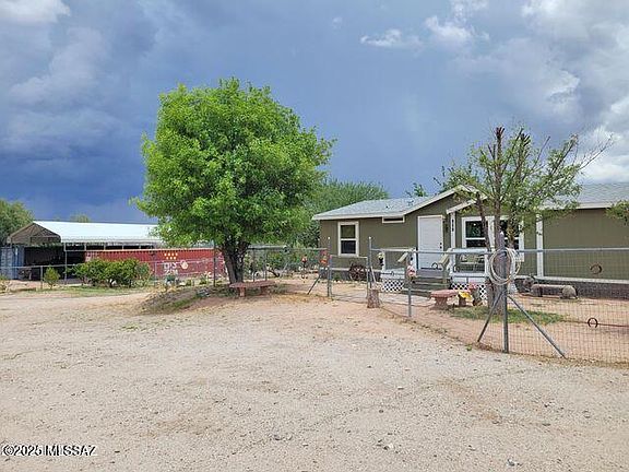Secluded 5+ acres at the end of the road. 3 bedroom 2 bath remodeled home. Well cared for appreciated property. Master bedroom separate from the other two bedrooms. Laminate flooring throughout. Two container covered shop/garage with high clearance, 32'x 45' with concrete pad. RV hookups. 35'x 61' Barn/Horse stalls, with 2 tack sheds. Property is fully fenced. Garden with grape vines and apple trees. Beautiful hideout not far from Benson.