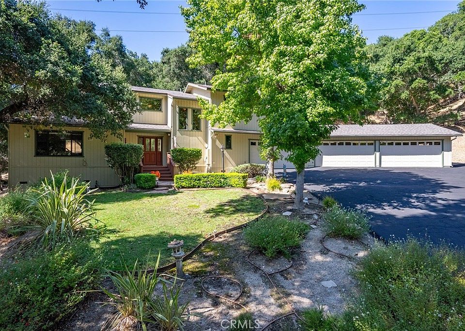 NESTLED IN THE OAKS with a 6 CAR GARAGE! Cherished home located in the highly desirable Las Encinas neighborhood featuring 2006 sf, 3 bedrooms and 2.5 bathrooms plus a 6 CAR garage on 3.7 acres! The newly seal coated driveway brings you up to the home where you immediately notice the expanded 6 car garage! The garage is a car enthusiasts dream! The garages are finished with ceiling fans and offer a wonderful opportunity to either use it as a garage, convert to a workshop or potential to be an ADU (check with city). Inside the home you will enjoy the many windows that capture the majestic oaks that populate the property. The open floorplan allows great flow between the kitchen, dining and living room with vaulted, wood beam ceilings. The pellet stove in the living room warms the home beautifully and is a focal point that anchors the space. Upstairs you will find the two guest bedrooms, main bathroom and primary suite. The expansive primary suite boasts a large bedroom, walk in closet, ensuite bathroom and sitting area that leads to a private deck. Outside offers a lovely place to relax and entertain. The deck is located off the living room and dining area and is a wonderful spot to enjoy a meal or visit with friends or family. You will also find a fantastic gazebo that is adorned with cafe lights that would be a delightful spot to spend time and read a book or enjoy a drink. The property is located at the North end of Atascadero and is close to shopping and freeway access. Please see Virtual Tour for additional information including room dimensions.