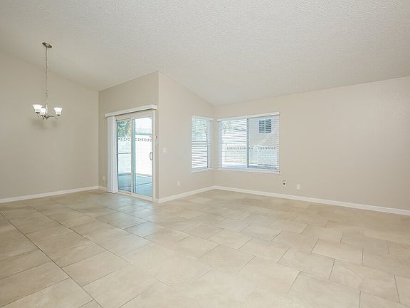 Check out this lovely Las Vegas rental home with three bedrooms and two bathrooms on one convenient level. This residence has an expansive living room with a big front-facing window and a lighted ceiling fan. Glass doors welcome fresh air and light as you enjoy meals beneath a chic chandelier in the adjacent dining area. The kitchen boasts white quartz counters and sleek appliances in stainless steel. A window sits above the double sink. In the main bedroom, you'll sleep soundly beneath a comforting ceiling fan. The en suite bathroom is a delightful place to unwind, featuring an all-white vanity with a combination bathtub and shower with a white tile surround.