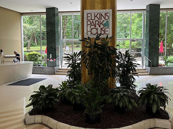 Spacious studio condo on the 2nd floor of the beautiful Elkins Park House. ( Building B ) This affordable condo enjoys a lovely wooded view from its large picture windows that provide lots of natural light. There is an updated kitchen with white cabinets, stainless steel appliances, tile backsplash. Refrigerator is included. Ceramic tile bath with tub/shower plus extra storage area. Open floor plan allows for a variety of furniture placement options. Condo fee includes 24 hour doorman, heat, hot water, cooking fuel, snow and trash removal. lawn care. There is also an outdoor swimming pool and gym/fitness area. Great location with train a short walk and public transportation right out front.