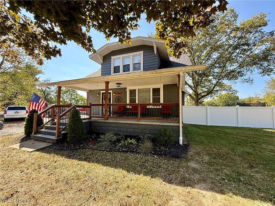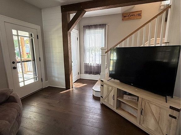 Step onto the inviting stamped concrete front porch and into a bright, spacious interior featuring 9-foot ceilings, restored barn beams, and high-quality hardwood floors throughout the main level. The open-concept living and dining rooms offer great flow, with a bay window and decorative molding that frame the space perfectly. The completely remodeled kitchen (2019) features custom concrete countertops, newer appliances, stylish cabinetry, and an eat-in layout ideal for entertaining. Just off the kitchen, you’ll find a convenient laundry room/half bath combo with sliding barn door, counter space, and cabinetry. A door leads to the covered back porch and private, fully fenced backyard—perfect for relaxing or entertaining. Upstairs, enjoy refinished original hardwood floors, spacious bedrooms, and huge walk-in closets. The full bath has been beautifully updated with tile flooring, a large soaking tub, new vanity, and custom tile surround. The finished basement adds even more living space, plus tons of storage. Major updates include: new roof, windows, furnace, A/C, propane heat, well pump, pressure tank, and updated electrical—all within the last 6 years!