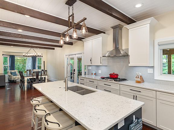 Discover this multi-generational & meticulously maintained 3-bedroom, 2.5-bath home nestled in the heart of the highly sought-after Stonehenge community in North Raleigh. Step inside to a bright and inviting family room featuring rich hardwood floors, an original brick fireplace, and stunning wooden ceiling beams that add warmth and character. The open layout flows effortlessly into a custom-designed kitchen and dining area—ideal for entertaining. Enjoy elegant white shaker cabinetry, solid surface countertops, stainless steel appliances, a gas range, and a dedicated waterline for your coffee maker. The first floor also includes a spacious home office, a convenient half bath & laundry, and an owner's suite. The en-suite bath offers a spa-like retreat with a step-free walk-in shower, a freestanding soaking tub, and a large walk-in closet. Upstairs, you'll find two generously sized bedrooms, each with hardwood flooring and ample closet space, connected by a Jack & Jill bathroom featuring modern quartz countertops & tile flooring. Step outside into your own tropical oasis—a lush backyard complete with a large in-ground pool, a custom-built deck, and mature landscaping that creates a private, serene setting perfect for gatherings. Bonus alert: Above the oversized two-car garage, a separate apartment provides ideal guest accommodations with its own kitchen, full bath, and living area. Situated on a quiet cul-de-sac, this charming residence offers both privacy and convenience—just minutes from Creedmoor Road and I-540.