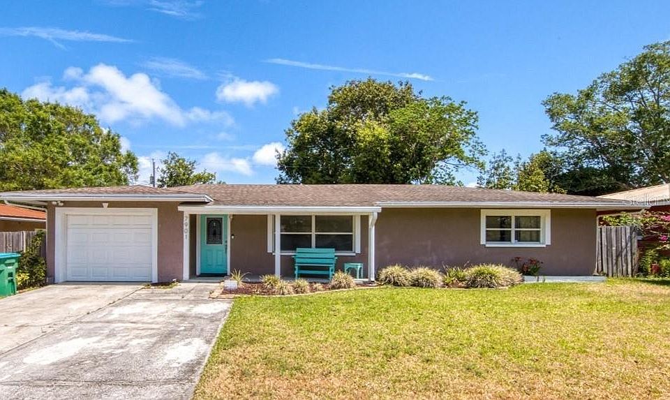 This beautifully updated block home features a spacious Master Bedroom and Bath with vaulted ceilings, a walk-in closet, and French doors that lead out to the patio. The Master Bath boasts a double vanity, a large shower, and a separate jetted tub for the ultimate relaxation experience. Additionally, the third bedroom is located just off the Master Bedroom, making it perfect for use as a study, nursery, media room, or office. The open, split bedroom floor plan includes an inside laundry area and an L-shaped Living Room, providing ample space for comfortable living. The Kitchen is fully equipped with stainless steel appliances, a breakfast bar, and wood cabinets for all your cooking needs. The house features laminate flooring throughout the living areas and carpet in the three bedrooms. The second bath includes a soaking tub and travertine floors and walls for added luxury. The backyard is fenced and spacious enough to accommodate a pool, making it perfect for outdoor entertainment. The house is located in the highly sought-after Seminole school district and is close to parks, schools, shopping, and the Gulf Beaches. This stunning property is move-in ready, and the best part is that flood insurance is not required. Don't miss this opportunity to make this beautiful home your own!