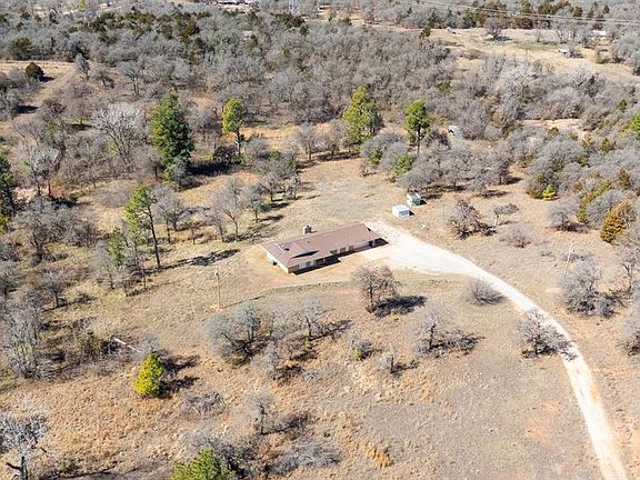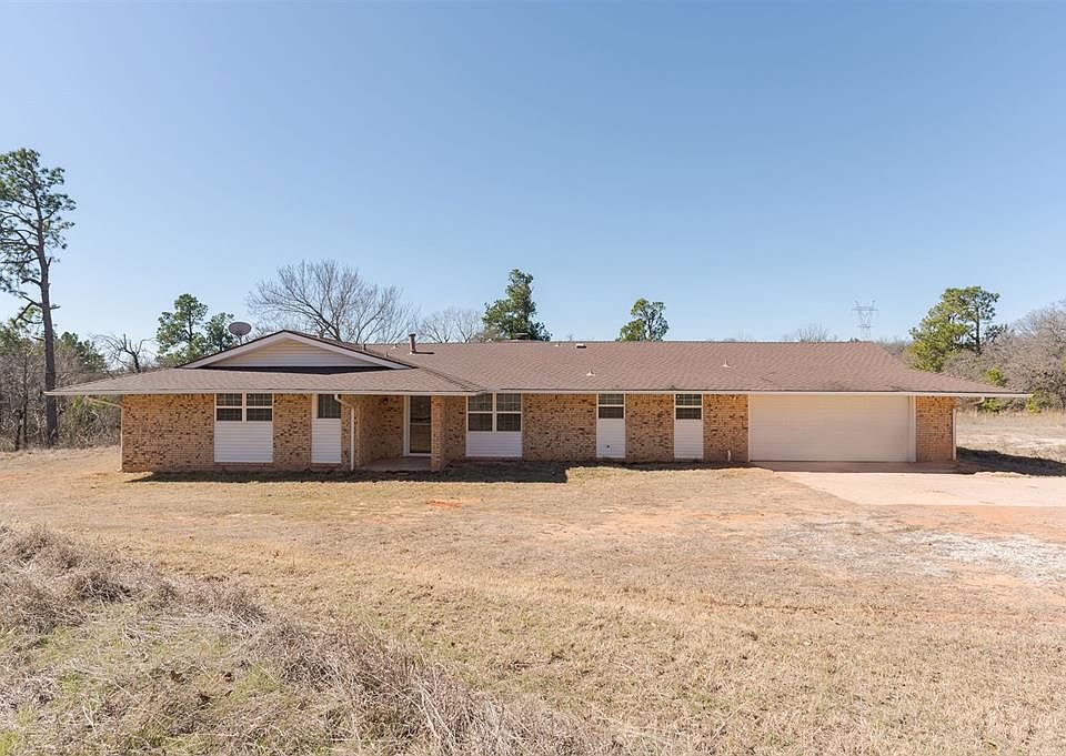 Experience country living in this ranch-style home located in Oklahoma City. Set on 11.08 acres, the property features expansive rural space and a variety of tall trees, providing a peaceful environment. The home's open-concept design includes wood tile flooring throughout, a brick fireplace, and an updated kitchen with excellent cabinet storage, creating a functional and inviting atmosphere. The seamless layout connects the kitchen, living area, and dining space, ideal for both daily living and entertaining. This home offers three spacious bedrooms and two full baths, ensuring comfort. This property is accessed by a lengthy gravel road, providing distance from the main road, and includes a small utility building for your storage needs. Don’t miss out on this opportunity!