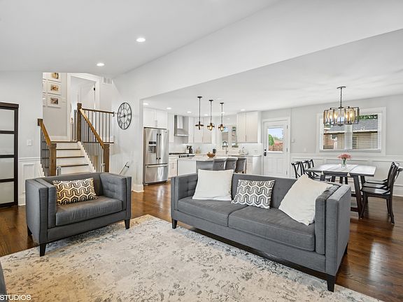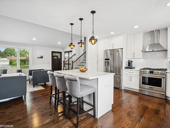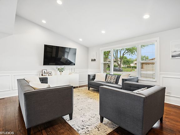 Impressive modern split level home in Morton Grove where everything has been modernized. Walk into the inviting open plan, high cathedral ceiling living room space with solid hardwood floors throughout, elegant wainscoting, LED recessed lighting, and open views of the privacy-fenced yard. The dream kitchen amazes with Quartz counters, custom 42" cabinetry, cozy island with breakfast area, stainless steel appliances and accent under cabinet lighting. Dining room area has plenty of space and great natural light for entertaining. Just a few steps up to the bedroom level there are three spacious rooms and a designer bathroom with all new fixtures. The roomy lower-level family room has plenty of natural light and window lines, full bathroom with all modern amenities, and a practical mudroom/laundry area with access from the backyard. Step out back and you have a perfect space to relax and enjoy the private yard, patio area, and garden (tomatoes, peppers, zucchini, strawberries). Extra-wide driveway with room to park multiple cars, and a 2.5 car garage. So much has been done: new roof in '23, garage door w/smart opener '20, privacy fence 5-6 yrs, windows '17, hot water tank '17. Proximity to all area amenities and Milwaukee/Golf shopping district. ACT FAST