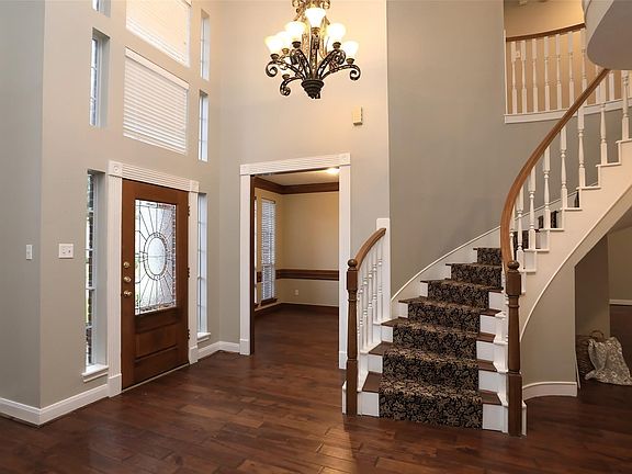 Stately and rare 5-bedroom 3.5 bath home w/ sparkling pool & spa is on a quiet Cul de Sac. Great floor plan features two story entry with spiral stairs + second stairs, updated kitchen open to the den & gas log fireplace, kitchen w/granite counters, stainless appliances, plus gorgeous hand scraped hardwood floors throughout the first floor. Living areas include both formals plus den and game room on the second floor. Private study in the front of the home is great for working at home! Master bedroom is huge with hand scraped hard wood floors and view of the backyard pool and spa! 4 nicely sized bedrooms on the second floor with two full bathrooms. Trane ACs 2015, Carpet 2021, hardiplank siding 2016, roof 2019, pool heater, pump and blower 2020/2021, motorized upper blinds 2018, new paint 2021. Great location on a quiet street; NEVER FLOODED! Be sure to check out the new neighborhood water park & community clubhouse! Lease includes washer, dryer & refrigerator.