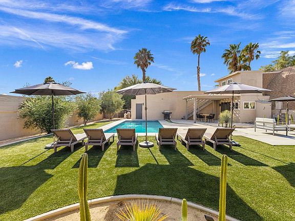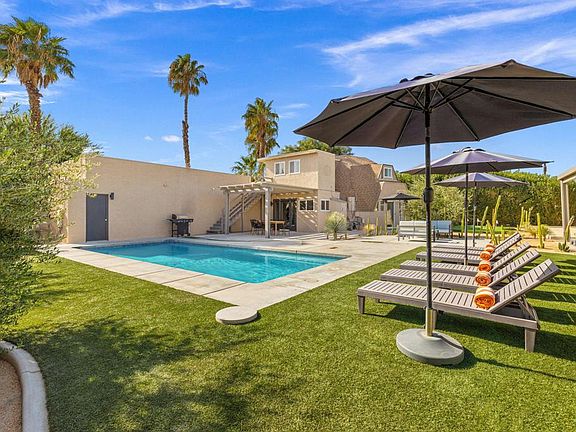 This exceptional desert property is truly something special. With its unique geodesic dome design, this stunning 3-bedroom, 2-bathroom home is an architectural masterpiece that perfectly blends style and functionality. Situated on a spacious 12,197 sq. ft. lot with no HOA, the possibilities here are endless. The home features a large primary bedroom, and the massive 3-car garage is ready for whatever you dream up--whether it's a game room, entertainment space, or extra storage. The outdoor area is an entertainer's paradise, complete with an expansive pool, hot tub, putting green, and bocce ball court. Plus, there's plenty of room to add an ADU if you want to expand or maximize the property's potential. Located close to shops, restaurants, and golf courses, this home is perfect for enjoying both quiet relaxation and lively activities. Even better, the area allows short-term rentals, making this an ideal investment opportunity for generating income. Whether you're looking for a unique personal retreat or a profitable rental property, this property has it all. Don't miss your chance to own this rare gem!