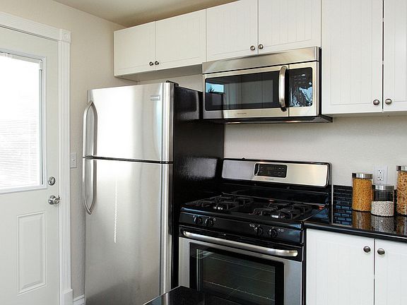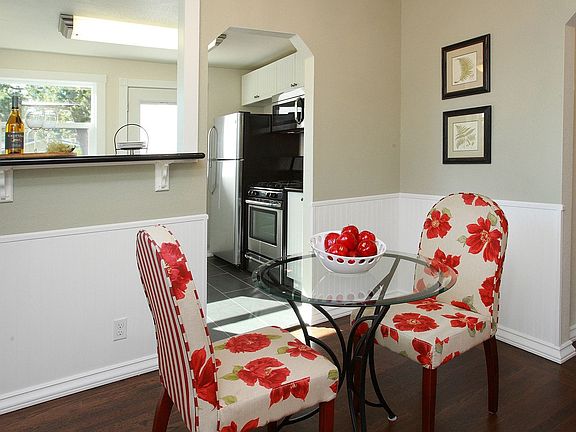 This property is available. Please inquire on this site to schedule a showing. Updated 2 bedroom, 1 bath home + 1 car garage w/storage! Home includes hardwood flooring and new paint with crown molding throughout. This home includes a brand new kitchen with stainless steel appliances (dishwasher, gas stove, refrigerator) and designer backsplash.- plenty of room in beautiful white cabinets and sleek black countertops. Spacious living room and separate dining area with chandelier. Modern bathroom with newer tile and fixtures. Large private backyard, back deck, and lower patio area. No Smoking. Security Deposit equal to 1 month's rent. Small pet negotiable with additional deposit. Tenant responsible for all utilities. Bi-monthly landscape service included for front/back yards.