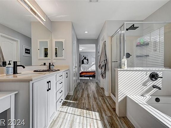 Modern, open 4-bedroom property with one room downstairs. Recently remodeled with Italian porcelain wood-look tile, dual tone soft close cabinets, glass backsplash, island and granite countertops. Features a wine room or extra pantry, large loft, and sitting room in primary bedroom with dual gas fireplace. Large finished backyard with pet-friendly draining turf, pavers, and a tiled covered patio. Nuvo, whole house, saltless water softener. Custom solar screens on all windows that help with electric bill. Custom modern security screen on front door. Completed Garage with epoxy floor and overhead storage racks. Water heater replaced 2 years ago. Around the corner from top rated Elementary school.
