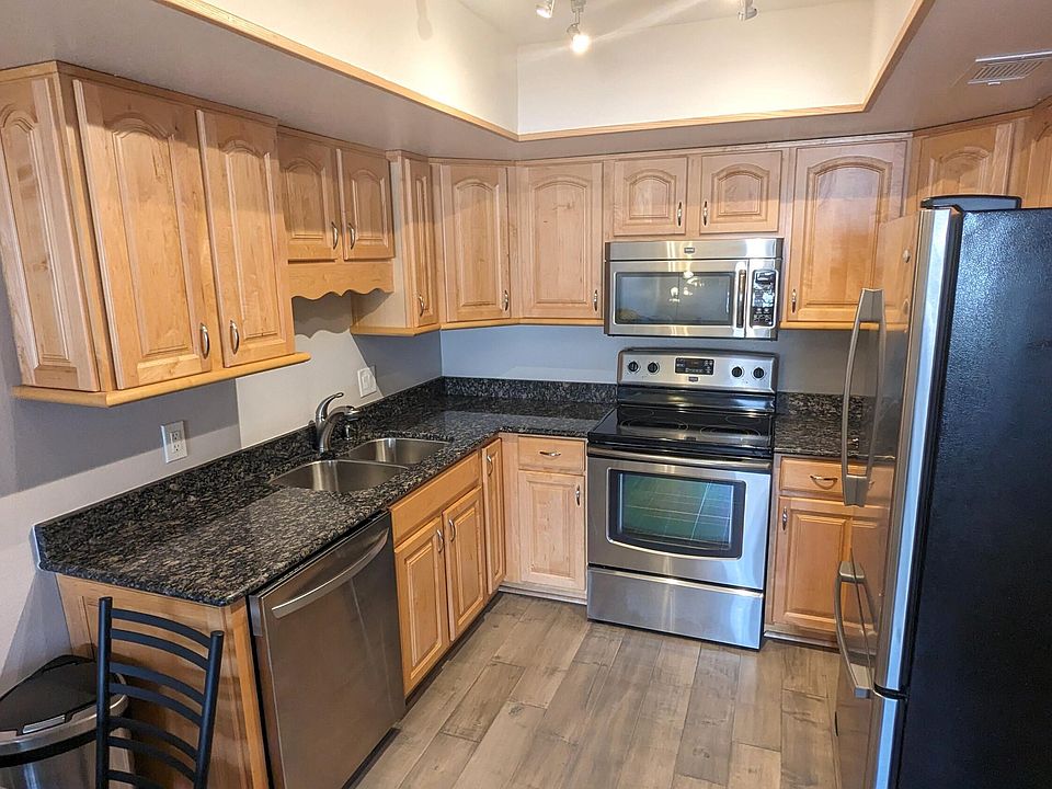 Track lightingWalk-in closetGranite countersGranite countertopsUndermount cabinet lightingSpacious primary suiteWood-look tile flooring