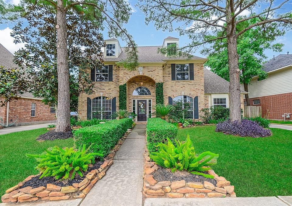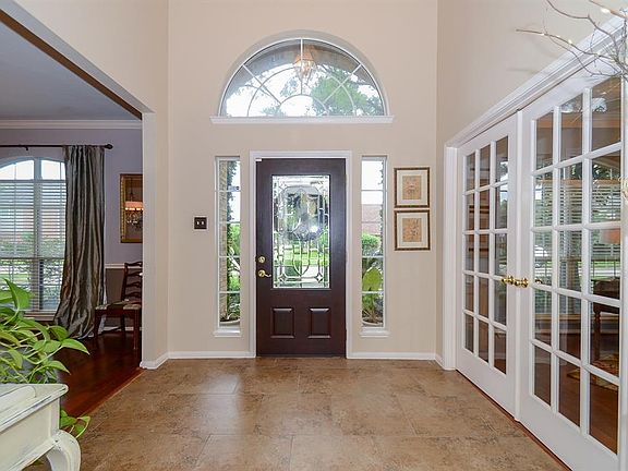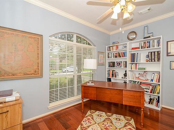 Gorgeous home welcomes you in with lush landscaping! Serene backyard paradise with swimming pool, spa, covered patio and landscaping! This Emerald built floor plan offers high end updates including patterned Berber carpet on stairs and upstairs hall, game room and bedrooms, elegant hardwood flooring in master bedroom, partial stairs, family room, study, formal dining! Other recent updates include pool heater, dishwasher, bookcase in living and media. Floor plan has study with French doors, formal dining with elegant drapery, large family room with striking view of backyard pool, kitchen with oversized island/breakfast bar and big pantry, breakfast room fit large table, private master suite with luxurious stone walk in shower, garden tub and two closets! The upstairs floor has two full bathrooms, three bedrooms with walk in closets plus enclosed game room with closet (could be 5th bedroom). No Flooding!!