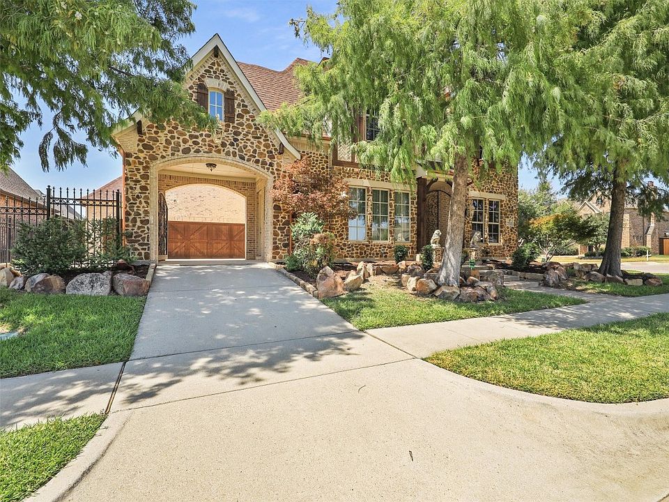 Welcome to your dream home with it's distinctive Texas Tuscan architectural style featuring an intricate elevation with a Porte cochere. This Shaddock home sits in a serene location within The Tribute and is the epitome of luxury living. As you step inside, you're greeted by the well appointed office with custom millwork and a fireplace. The heart of this home is the gourmet kitchen, equipped with JennAir appliances, butler's pantry, pot filler, and a built-in refrigerator that seamlessly blends into custom cabinetry. The expansive living area features beams, decorative lighting, and a fireplace with intricate stonework, providing a cozy focal point for gatherings with family and friends. The primary suite is a sanctuary of relaxation with a sitting area with a fireplace, soaking tub, separate shower, and dual vanities, all adorned with elegant Tuscan-inspired fixtures and finishes. The second floor features 3 bedrooms, 3 bathrooms, a media room, and game room with built in bar.